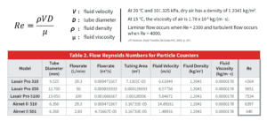 Re was calculated for each of the three Lasair Pro counters under review as well as two, fixed location Airnet II particle sensors. It can be seen in Table 2 that turbulent flow exists in the transport tubing to the Lasair Pro particle counter, irrespective of the flow rate chosen. This verifies that the losses due to particle transport are minimized. However, it does not mitigate all losses, and further testing is required to demonstrate empirically what those losses …