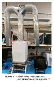 (Figure 2). Each of the units under test: Lasair III 310C, Lasair III 350L and the Lasair III 5100, had 2 meters (2 m) of tubing attached and the inlet of this tubing was located adjacent to the reference unit input. This minimized any sample errors and ensured that the same number of particles was delivered to each transport mechanism, tubing, or directly to the sample inlet.