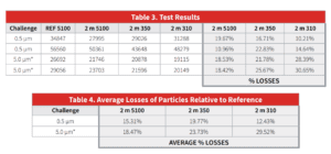 - Average losses for particles in 2 m of transport tubing for large (5.0 µm) particles are between 17% and 27%. This is reflective of previously published data from Particle Measuring Systems3.